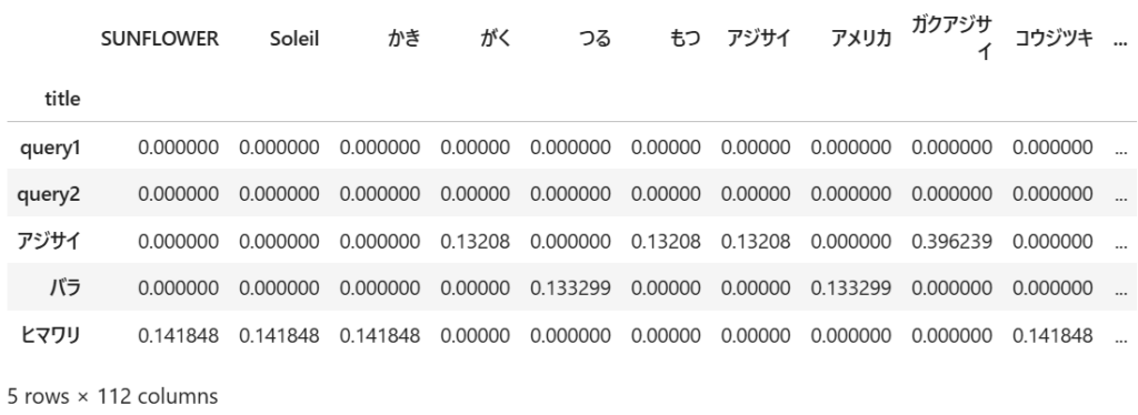 「title」列が2つの検索クエリと3つの説明文を表し、「SUNFLOWER」以降の列名が抽出された各単語を表しています。対象の文章に登場しない単語は、TF-IDFの値がゼロとなっていることが分かります。